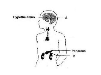 Question: Direction (For Qs. 38 and 39): The given figure shows two endocrine glands (marked as A and B) and the hormones (marked as 1 and 2) secreted from them.