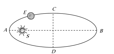 Question: The earth E moves in an elliptical orbit with the sun S at one of the foci as shown in figure . Its speed of motion will be maximum at the point [BHU 1994; CPMT 1997]