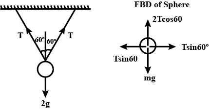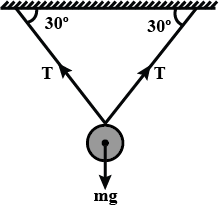 $ 2T\cos 60{}^\circ =mg\text{ or }T=\frac{mg}{2\cos 60{}^\circ}=\frac{20}{2\times 0.5}=20\text{ N}\text{.} $