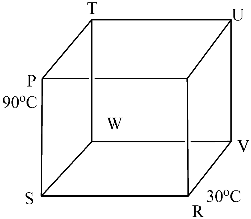 Question: 12 identical rods made of same material are arranged in the form of a cube. The temperature of P and R are maintained at $ 90{}^\circ C $ and $ 30{}^\circ C $ respectively. Then the temperature of point V, when steady state is reached is