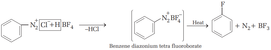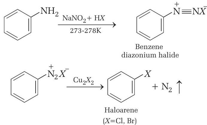 - $$ \text{C}_6\text{H}_5\text{N}_2^+ \text{Cl}^- + \text{CuCl} \rightarrow \text{C}_6\text{H}_5\text{Cl} + \text{N}_2 $$
