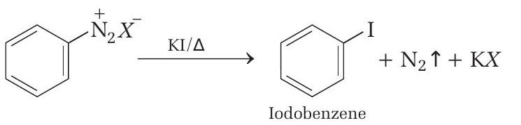 - $$ \text{C}_6\text{H}_5\text{N}_2^+ \text{Cl}^- + \text{KI} \rightarrow \text{C}_6\text{H}_5\text{I} + \text{N}_2 + \text{KCl} $$