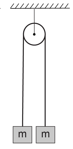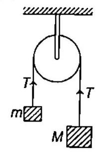 ##### Two blocks of masses $m$ and $M$ are connected by means of a metal wire of cross-sectional area $A$ passing over a frictionless fixed pulley as shown in the figure. The system is then released. If $M=2 m$, then the stress produced in the wire is $\rightarrow$ JEE Main (Online) 2013