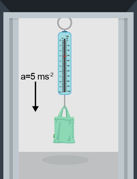 ##### A spring balance is attached to the ceiling of a lift. A man hangs his bag on the string and the balance reads 49 N , when the lift is stationary. If the lift moves downwards with an acceleration of $5 \mathrm{ms}^{-2}$, the reading of the spring balance would be