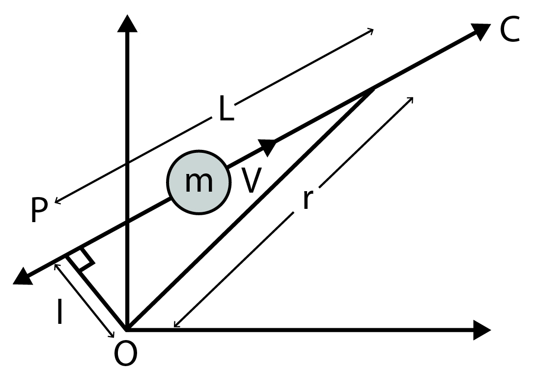 ##### A particle of mass $m$ moves along line $P C$ with velocity $v$ as shown in the figure. What is the angular momentum of the particle about $O$ ?