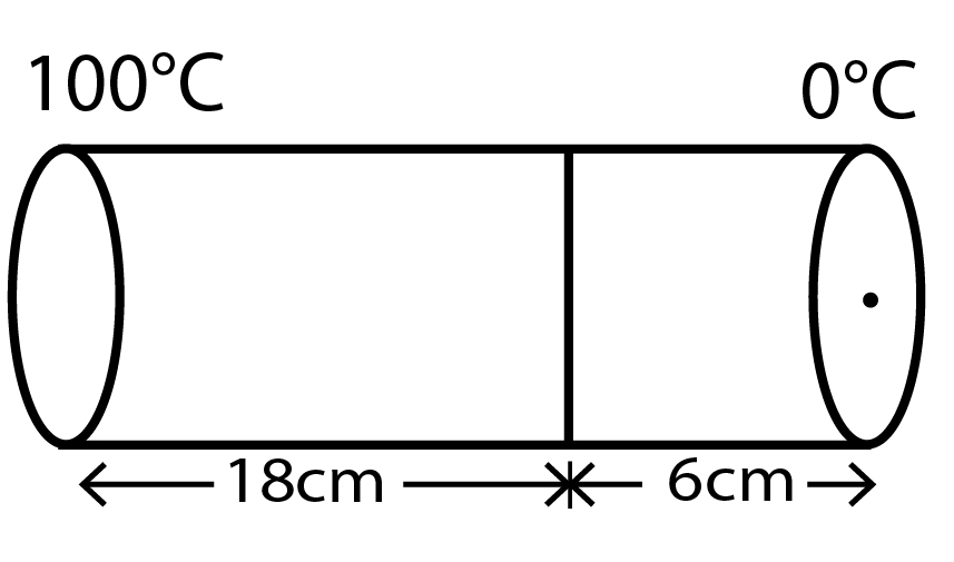 ##### The coefficient of thermal conductivity of copper is 9 times that of steel. In the composite cylindrical bar shown in the figure, what will be the temperature at the junction of copper and steel?