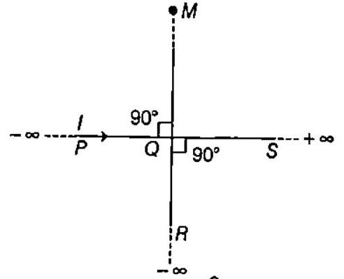 ##### An infinitely long conductor $P Q R$ is bent to form a right angle as shown. A current $I$ flows through PQR. The magnetic field due to this current at the point $M$ is $H _{1}$. Now another infinitely long straight conductor $Q S$ is connected at $Q$, so that the current is $I / 2$ in $O R$ as well as in $Q S$, the current in $P Q$ remaining unchanged. The magnetic field at $M$ is now $H _{2}$. The ratio $H _{1}: H _{2}$ is given by