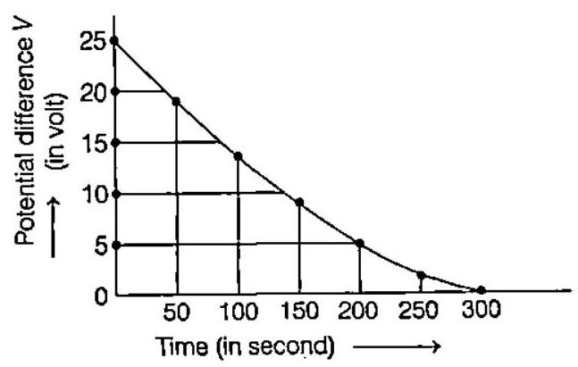 ##### The figure shows an experimental plot discharging of a capacitor in an $R-C$ circuit. The time constant $\tau$ of this circuit lies between $\rightarrow$ AIEEE 2012