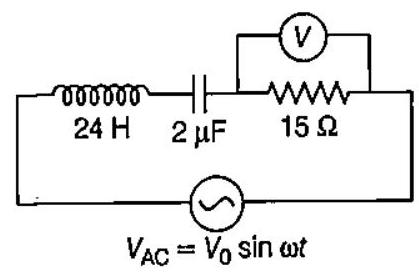 ##### An L-C-R circuit as shown in the figure is connected to a voltage source $V _{A C}$ whose frequency can be varied. The frequency, at which the voltage across the resistor is maximum, is $\rightarrow$ JEE Main (Online) 2013