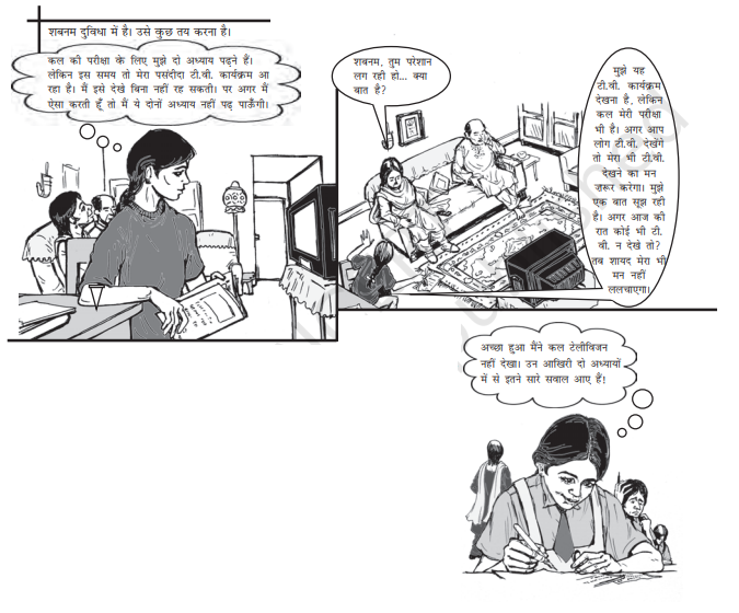 शबनम ने टी.वी. देखने की बजाय अपने अध्यायों को दोहराने का फ़ैसला लिया। |