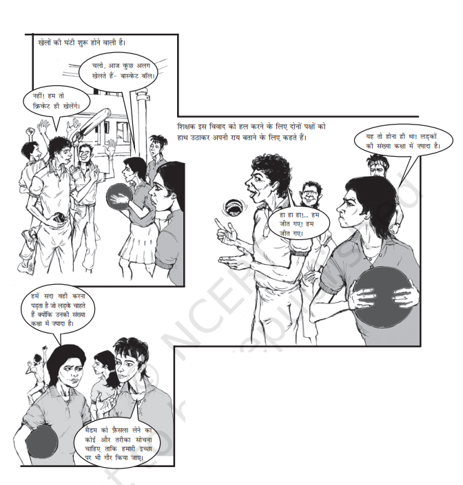 शिक्षक इस विवाद को हल करने के दोनों पक्षों को हाथ उठाकर अपनी राय बताने के कहते हैं।