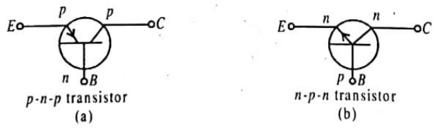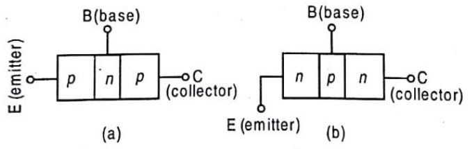 Transistors are three terminal (solid state) devices just like triode. It can be assumed to consist of two back to back $p-n$ junctions. In practice a junction transistor ( $p$ - $n$ - $p$ ) consists of silicon (or germanium) bar crystal in which a layer of $n$-type silicon (or $Ge$ ) is sandwiched between two layers of $p$-type silicon and we get $p$ - $n$ - $p$ transistor. Alternatively, it may consist of a layer of $p$-type between two layers of $n$-type material and we get a $n-p-n$ transister as shown by figure.