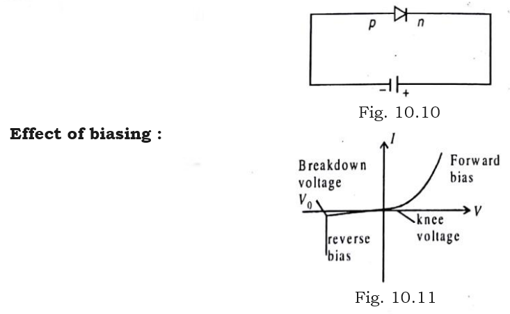 In forward bias, the thickness of depletion layer decreases (and potential barrier height also reduces), while in reverse bias, the thickness of depletion layer increases and potential barrier also increases). In forward bias the current increases exponentially and in reverse bias, the current remains constant at very small magnitude upto break down voltage $V_0$ and after that it increases sharply without any further increase of reverse voltage (shown by figure). The effect of forward biasing and reverse biasing on potential barrier are shown in figure.