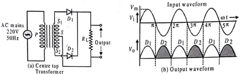 When the diode rectifies the whole of the $A C$ wave, it is called full wave rectifier. Figure shows the experimental arrangement for using diode as full wave rectifier. The alternating signal is fed to the primary a transformer. The output signal appears across the load resistance $R_L$.