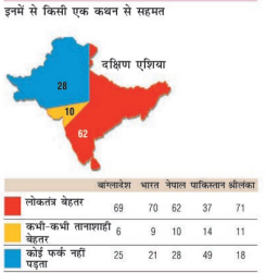 दक्षिण एशिया में लोकतंत्र का रिकार्ड मिला-जुला रहा है। इसके बावजूद दक्षिण एशियाई देशों की जनता लोकतंत्र की आकांक्षाओं में सहभागी है। इस क्षेत्र के पाँच बड़े देशों में हाल ही में एक सर्वेक्षण किया गया था। सर्वेक्षण से यह बात ज़ाहिर हुई कि इन पाँचों देशों में लोकतंत्र को व्यापक जन-समर्थन हासिल है। इन देशों में हर वर्ग और धर्म के आम नागरिक लोकतंत्र को अच्छा मानते हैं और प्रतिनिधिमूलक लोकतंत्र की संस्थाओं का समर्थन करते हैं। इन देशों के लोग शासन की किसी और प्रणाली की अपेक्षा लोकतंत्र को वरीयता देते हैं और मानते हैं कि उनके देश के लिए लोकतंत्र ही ठीक है। ये निष्कर्ष बड़े महत्त्वपूर्ण हैं क्योंकि पहले से माना जाता रहा है कि लोकतंत्र सिर्फ विश्व के धनी देशों में फल-फूल सकता है। इस लिहाज से देखें तो दक्षिण एशिया के लोकतंत्र के अनुभवों से लोकतंत्र की वैश्विक कल्पना का दायरा बढ़ा है।