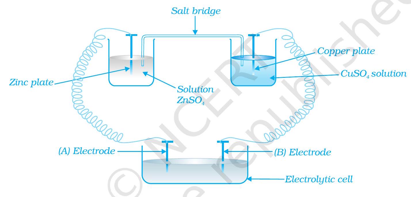 (ii) अब सेल ‘B’ गैल्वेनिक सेल के रूप में कार्य करेगा क्योंकि इसका EMF अधिक है, और यह सेल ‘A’ को विद्युत अपघटनी सेल की तरह चलाएगा।