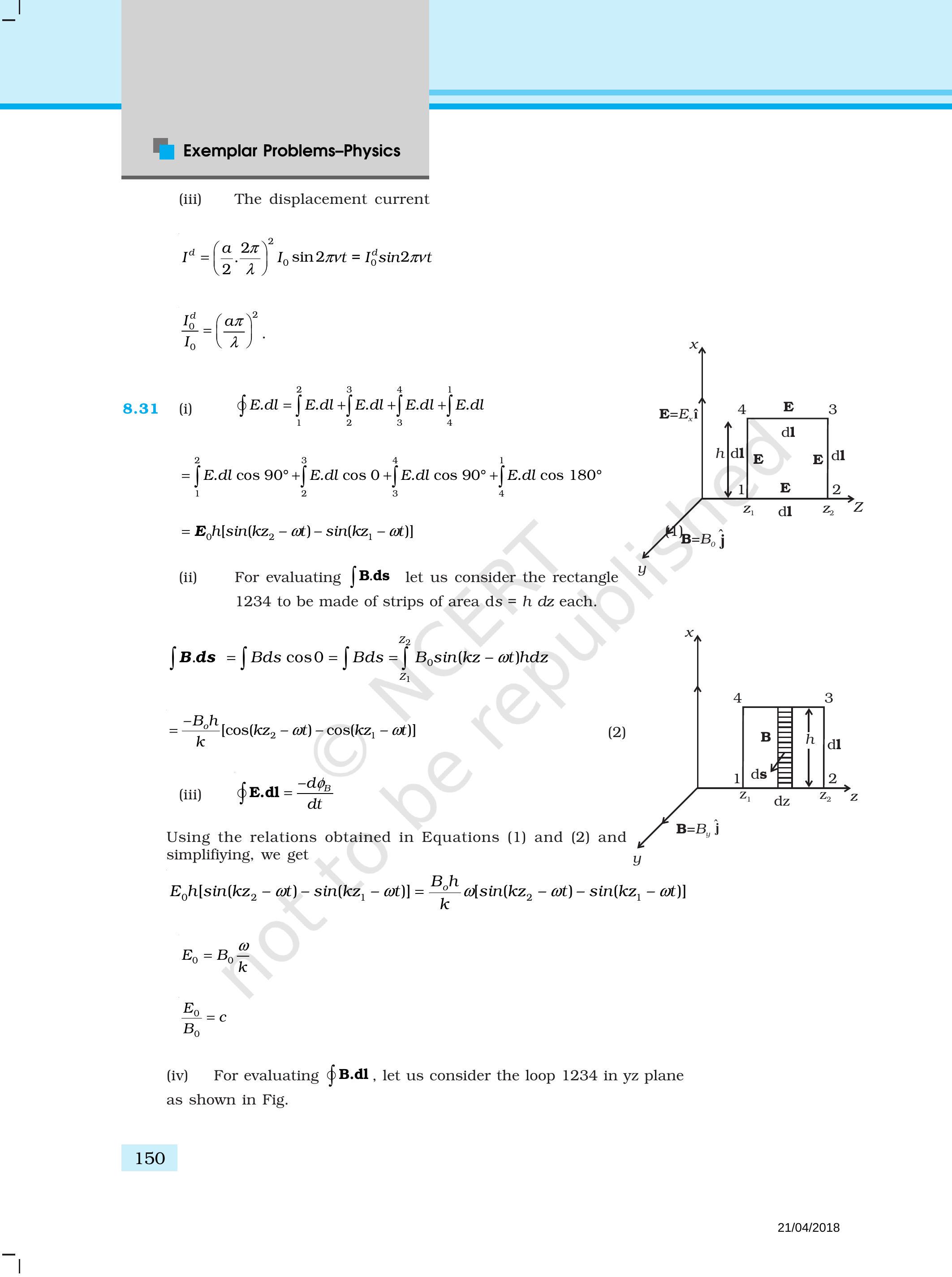 ~~ 8.32 $z$ दिशा में चलने वाली एकसर ईएम तरंग विवरण की प्रतिनिधि और $\mathbf{E}=E_0 \sin (k z-\omega t) \hat{\textbf{i}}$ और $\mathbf{B}=B_0 \sin (k z-\omega t) \hat{\textbf{j}}$ है। दिखाए गए हैं