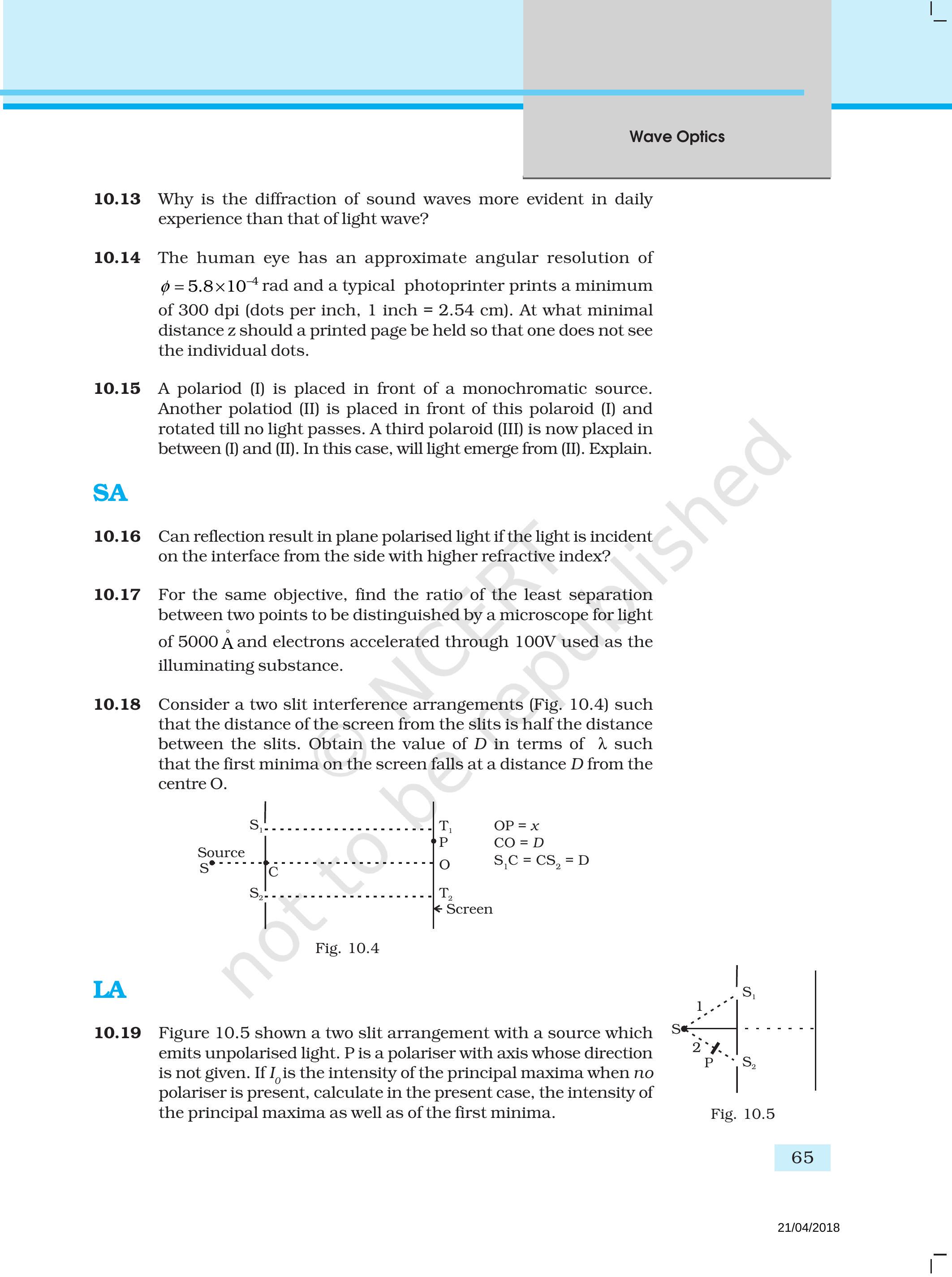 ~~ 10.14 मानवीय आंख का एक अंदाजित कोणीय ध्यानांक्ष वक़्ति $\phi=5.8 \times 10^{-4} rad$ और एक आम छापी संक्रामक की कम से कम ध्यानांक्षता $300 dpi$ होती है (डॉट प्रति इंच, $1 इंच=2.54 cm$). एक छापी गई पृष्ठ को किस न्यूनतम दूरी $z$ पर पकड़ा जाना चाहिए ताकि व्यक्ति को व्यक्त बिंदु न दिखाई दें।