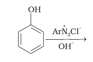 ~~ 61. यह प्रतिक्रिया किसी विद्युताक्षी के आंशिक पुनर्मिलन का एक उदाहरण है। केमिकल मध्यम में, फिनोल फिनॉक्साइड आयन उत्पन्न करता है जो फिनॉल से अधिक इलेक्ट्रॉन युक्त है और इसलिए विद्युताक्षीय हमले के लिए अधिक प्रतिक्रियाशील है। इस प्रतिक्रिया में विद्युतक आंशिक+ यानी एरिलडायज़ोनियम कैशन होता है। जितना सशक्त होगा विद्युतक उत्पाद, उत्पादन की गति उत्तेजित होती है। पी-नाइट्रोफिनाइलडायज़ोनियम कैशन, पी-टोल्यीन डाइऑनियम कैशन से शक्तिशाली विद्युतक होता है। इसलिए, यह फिनोल के साथ प्राथमिक रूप से जोड़ता है।