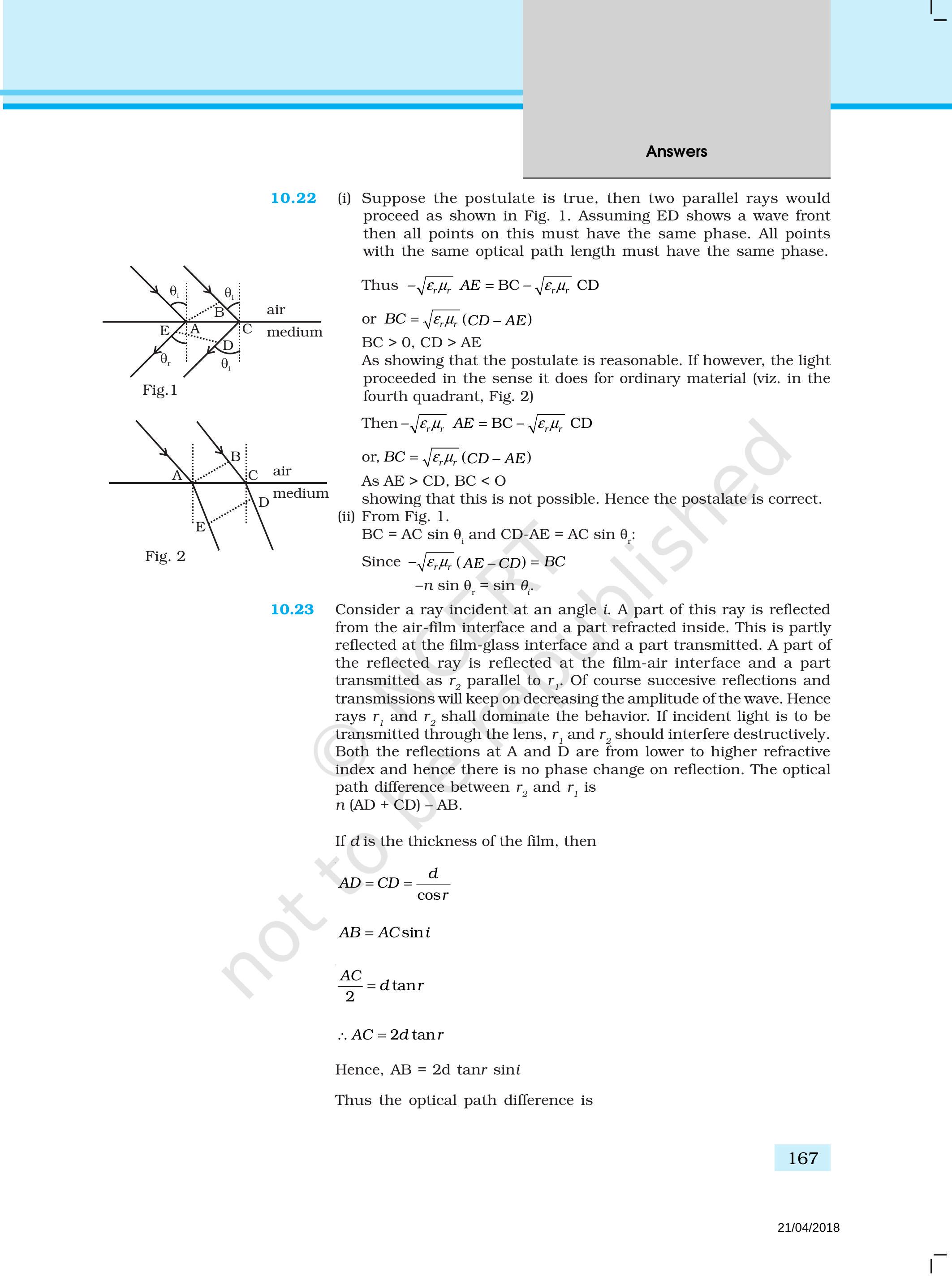 ~~ 10.22 (i) मान लो कि पोषण सत्य है, तो दो समांतर रेखाएं चित्र 1 में दिखाई देंगी। यदि ED एक तरंग मुख्य है तो इसके सभी बिंदुओं का एक ही चरण होना चाहिए। सभी बिंदुओं पर समान ऑप्टिकल पथ लंबाई वाला चरण वाले होने चाहिए।