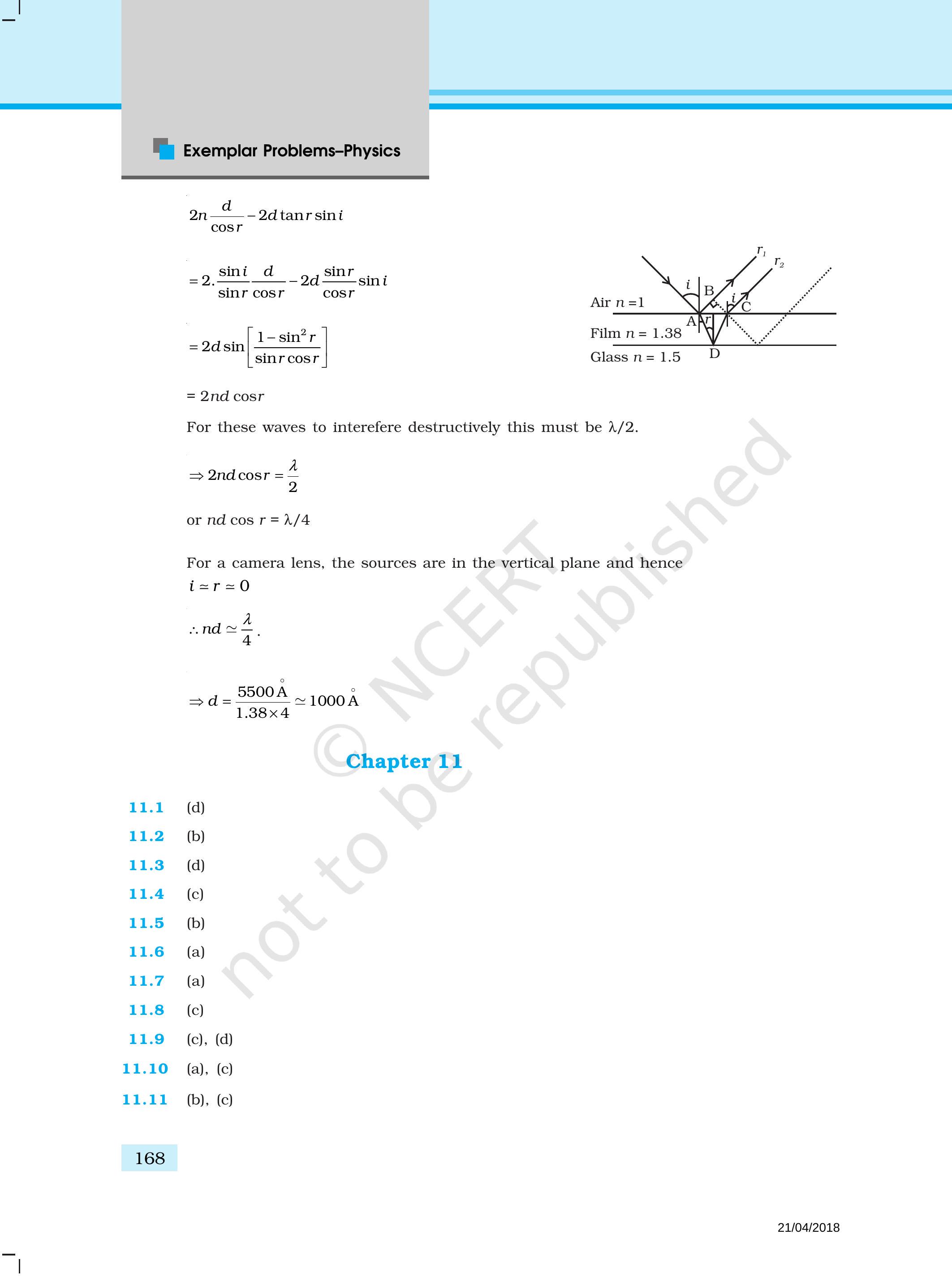 ~~ 10.23 एक किरण $i$ के कोण पर प्रवेश करती है। यहां से इस किरण की एक हिस्सा हवा-तार इंटरफेस पर प्रतिबिंबित होता है और एक हिस्सा अंदर से बिगोत्रित होता है। इसे फिल्म-कांच इंटरफेस पर भी बिगोत्रित किया जाता है और एक हिस्सा $r_2$ के रूप में पारगमन किया जाता है। बेशक लगातार प्रतिबिंब और ट्रांसमिशन संक्रमण तार का तनाव कम करते रहेंगे। इसलिए रेखाएँ $r_1$ और $r_2$ संवेदनशीलता का व्यवहार करेंगी। यदि प्रवेशित प्रकाश लेंस से प्रतिबिंबित होना हो, तो $r_1$ और $r_2$ का विनाशकारी रूप से प्रभाव देना चाहिए। $A$ और $D$ परिभाषित प्रतिबिंब एवं बढ़ी भोंतात्मकता पर वापसी होती है और इसलिए प्रतिबिंबित होने पर कोई चरित्र-बदलना नहीं होता है। $r_2$ और $r_1$ के बीच ऑप्टिकल पथ का अंतर $n(AD+CD)-AB$ है।