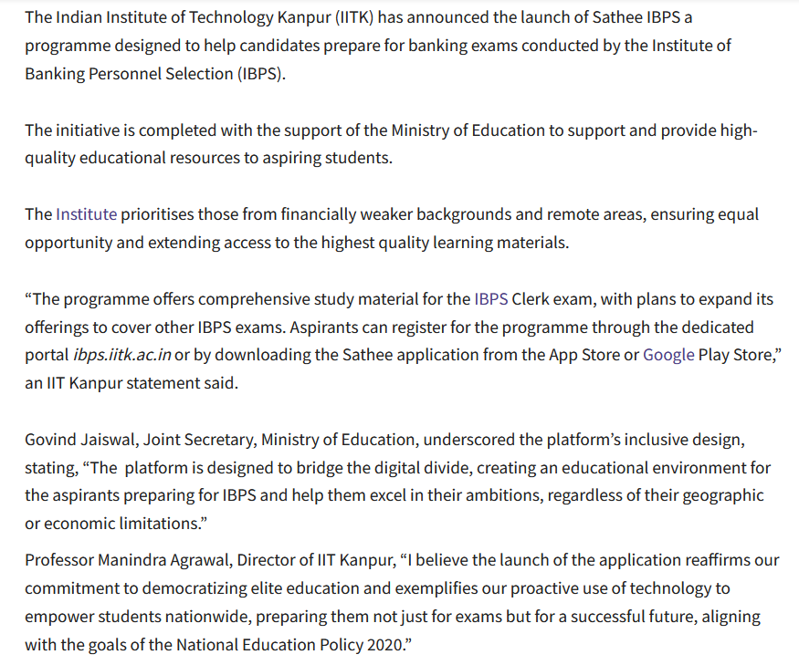 आईआईटी कानपुर ने बैंकिंग परीक्षा की तैयारी के लिए साथी आईबीपीएस लॉन्च किया