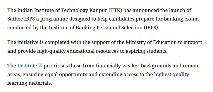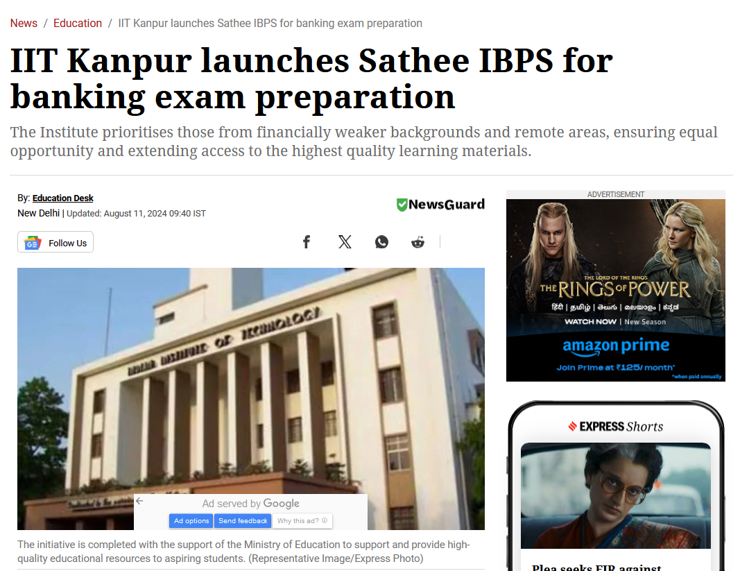भारतीय प्रौद्योगिकी संस्थान कानपुर (आईआईटीके) ने साथी आईबीपीएस कार्यक्रम लॉन्च करने की घोषणा की है, जो इंस्टीट्यूट ऑफ बैंकिंग पर्सनल सेलेक्शन (आईबीपीएस) द्वारा आयोजित बैंकिंग परीक्षाओं की तैयारी में उम्मीदवारों की मदद करने के लिए डिज़ाइन किया गया है।