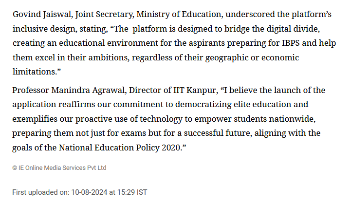 शिक्षा मंत्रालय के संयुक्त सचिव गोविंद जायसवाल ने प्लेटफॉर्म के समावेशी डिजाइन पर जोर देते हुए कहा, “यह प्लेटफॉर्म डिजिटल विभाजन को पाटने के लिए डिज़ाइन किया गया है, जो आईबीपीएस की तैयारी कर रहे उम्मीदवारों के लिए एक शैक्षिक वातावरण बनाता है और उनकी भौगोलिक या आर्थिक सीमाओं की परवाह किए बिना, उन्हें अपने लक्ष्यों में उत्कृष्टता प्राप्त करने में मदद करता है।” आईआईटी कानपुर के निदेशक प्रोफेसर मनींद्र अग्रवाल ने कहा, “मेरा मानना है कि इस एप्लिकेशन का लॉन्च अभिजात शिक्षा को लोकतांत्रिक बनाने के हमारे प्रयासों की पुष्टि करता है और देश भर के छात्रों को सशक्त बनाने के लिए प्रौद्योगिकी के सक्रिय उपयोग का उदाहरण है, जो उन्हें न केवल परीक्षाओं के लिए बल्कि एक सफल भविष्य के लिए तैयार करता है, जो राष्ट्रीय शिक्षा नीति 2020 के लक्ष्यों के अनुरूप है।”