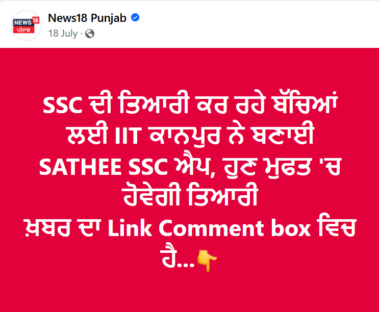 SSC ਦੀ ਤਿਆਰੀ ਕਰ ਰਹੇ ਬੱਚਿਆਂ ਲਈ IIT ਕਾਨਪੁਰ ਨੇ ਬਣਾਈ SATHEE SSC ਐਪ, ਹੁਣ ਮੁਫਤ 'ਚ ਹੋਵੇਗੀ ਤਿਆਰੀ ਖ਼ਬਰ ਦਾ Link Comment box ਵਿਚ ਹੈ