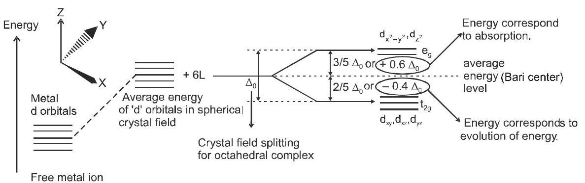 According to the crystal field theory the colour is due to the d-d transition of electron under the influence of ligands. We know that the colour of a substance is due to the absorption of light at a specific wavelength in the visible part of the electromagnetic spectrum (400 to $700 \mathrm{~nm}$ ) and transmission or reflection of the rest of the wavelengths.
