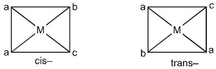 Square planar complex of the type $\mathrm{Ma}_{2} \mathrm{bc}$ (where $\mathrm{a}, \mathrm{b}, \mathrm{c}$ are unidentates) shows two geometrical isomers.