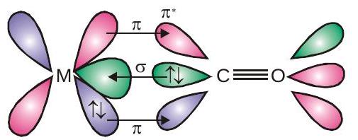 The $\mathrm{M}-\mathrm{C} \pi$ bond is formed by the donation of a pair of electrons from a filled $d$ orbital of metal into the vacant antibonding $\pi^{\star}$ orbital of carbon monoxide. Thus carbon monoxide acts as $\sigma$ donor $(\mathrm{OC} \rightarrow \mathrm{M})$ and a $\pi$ acceptor $(O C \leftarrow M)$, with the two interactions creating a synergic effect which strengthens the bond between $\mathrm{CO}$ and the metal as shown in figure.