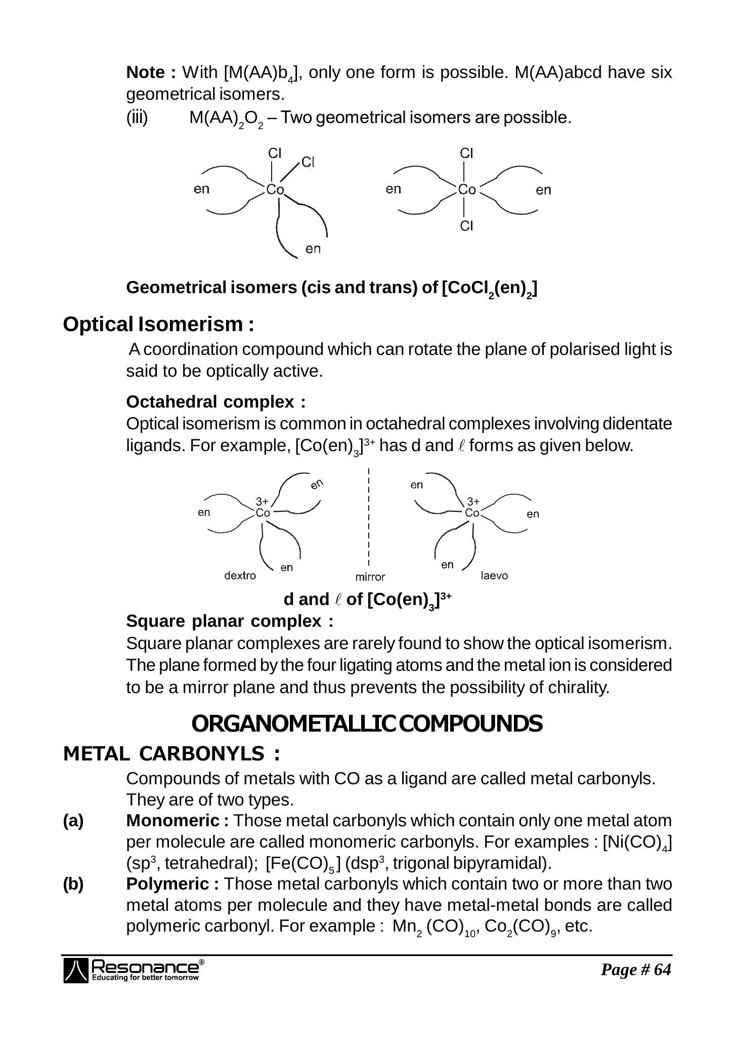 Optical isomerism is common in octahedral complexes involving didentate ligands. For example, $\left[\mathrm{Co}(\mathrm{en})_{3}\right]^{3+}$ has $\mathrm{d}$ and $\ell$ forms as given below.