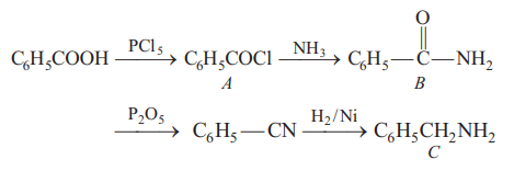 $ \begin{aligned} & C _6 H _5 COOH \xrightarrow{PCl _5} A \xrightarrow{NH _3} \\ & B \xrightarrow{P _2 O _5} C _6 H _5 CN \xrightarrow{H _2 / Ni} C \end{aligned} $