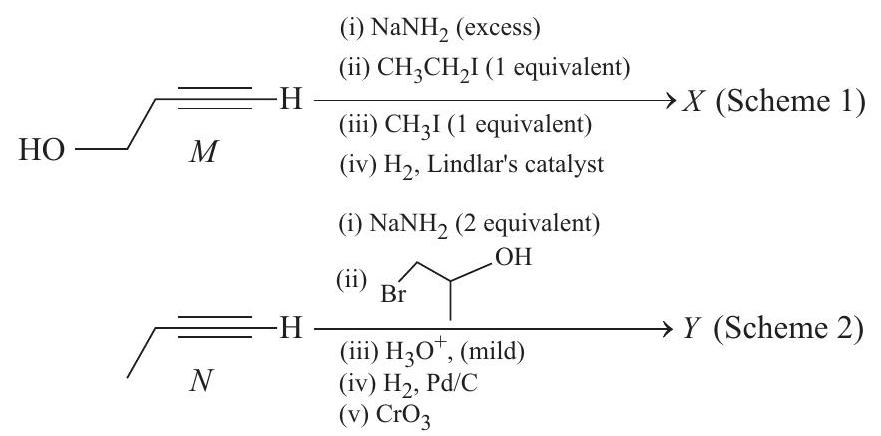 Schemes $1$ and $2$ describe sequential transformation of alkynes M and N. Consider only the major products formed in each step for both schemes.
