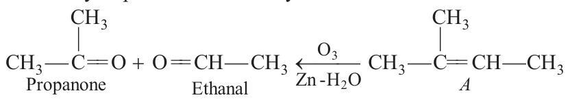 81. One mole of a hydrocarbon $A$ reacts with one mole of bromine giving a dibromo compound, $C _5 H _{10} Br _2$. Compound $A$ on treatment with cold dilute alkaline potassium permanganate solution forms a compound, $C _5 H _{12} O _2$. On ozonolysis $A$ gives equimolar quantities of propanone and ethanal. Deduce the structural formula of $A$.