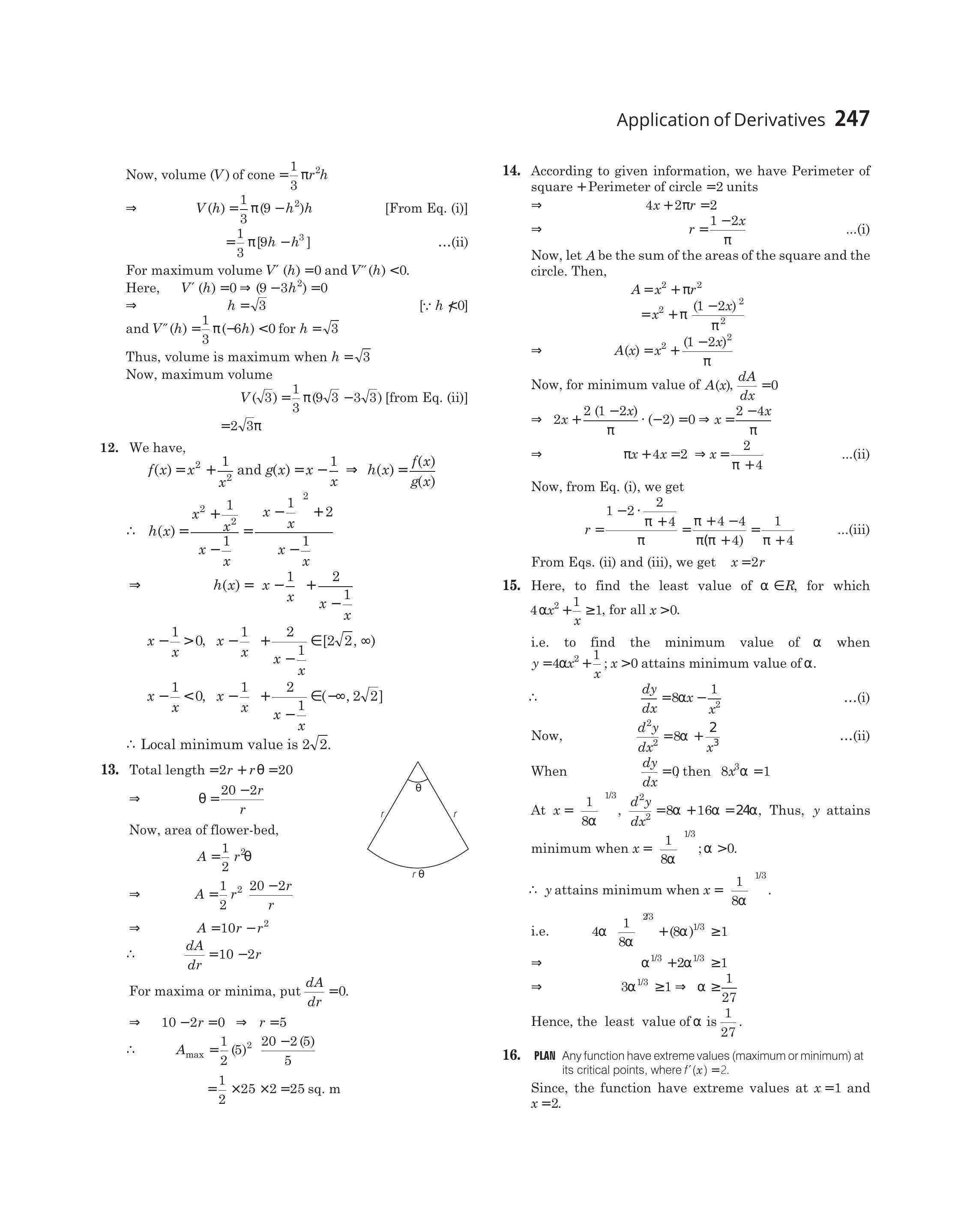 $ \begin{aligned} \Rightarrow \quad 10-2 r & =0 \Rightarrow r=5 \\ \therefore \quad A_{\max } & =\frac{1}{2}(5)^{2} [\frac{20-2(5)}{5}] \\ & =\frac{1}{2} \times 25 \times 2=25 \text { sq. } \mathrm{m} \end{aligned} $