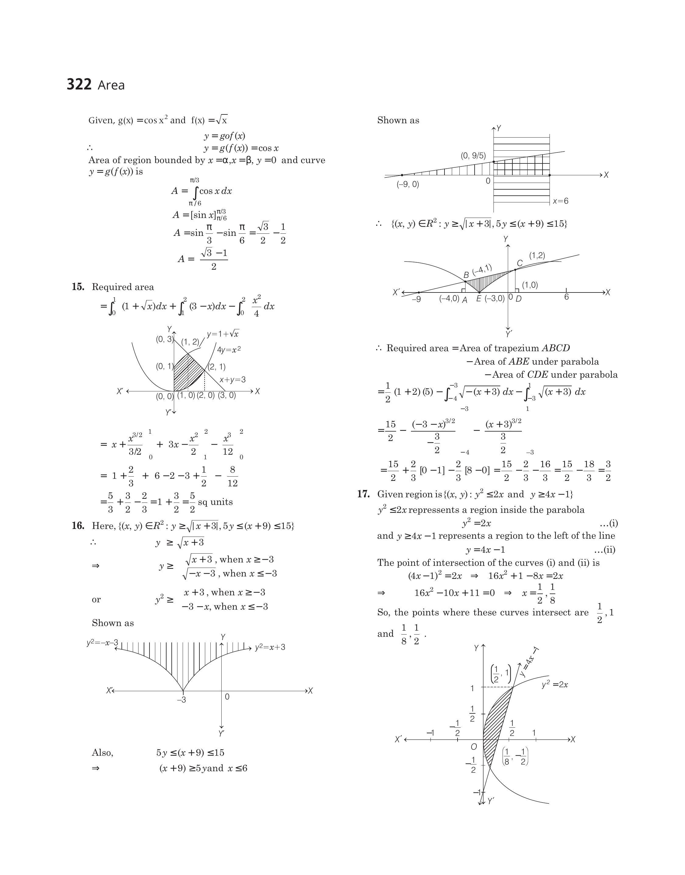 $ \begin{alignedat} & =\frac{1}{4} (\frac{y^{2}}{2}+y){ } _{-1 / 2}^{-1}-\frac{1}{6}\left(y^{3}\right) _{-1 / 2}^{1} \\ & =\frac{1}{4} [(\frac{1}{2}+1)-(\frac{1}{8}-\frac{1}{2})]-\frac{1}{6} (1+\frac{1}{8} )\\ & =\frac{1}{4} (\frac{3}{2}+\frac{3}{8})-\frac{1}{6} (\frac{9}{8}) \\ & =\frac{1}{4} \times \frac{15}{8}-\frac{3}{16}=\frac{3}{32} \text { sq units } \end{aligned} $