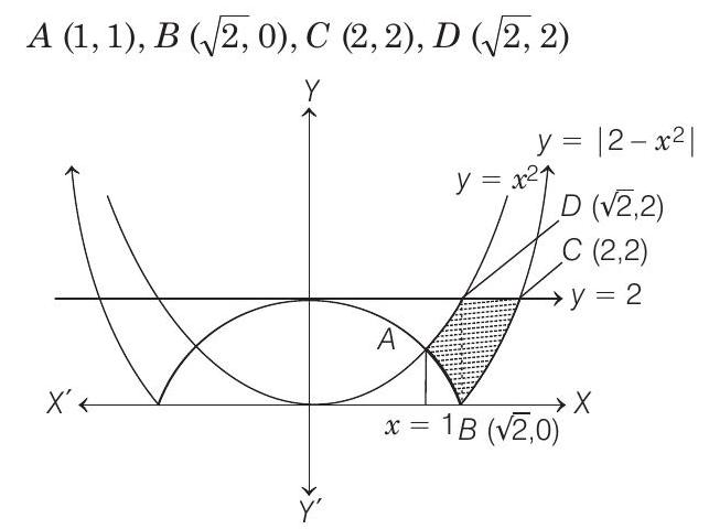 $ \begin{aligned} & =\int _{1}^{\sqrt{2}}\left\{x^{2}-\left(2-x^{2}\right)\right\} d x+\int _{\sqrt{2}}^{2}\left\{2-\left(x^{2}-2\right)\right\} d x \\ & =\int _{1}^{\sqrt{2}}\left(2 x^{2}-2\right) d x+\int _{\sqrt{2}}^{2}\left(4-x^{2}\right) d x \\ & =[\frac{2 x^{3}}{3}-2 x]^{\sqrt{2}} +[4 x-\frac{x^{3}}{3}]^{2} \\ & =[\frac{4 \sqrt{2}}{3}-2 \sqrt{2}-\frac{2}{3}+2]+[8-\frac{8}{3}-4 \sqrt{2}+\frac{2 \sqrt{2}}{3}] \\ & =(\frac{20-12 \sqrt{2}}{3}) \text { sq units } \end{aligned} $
