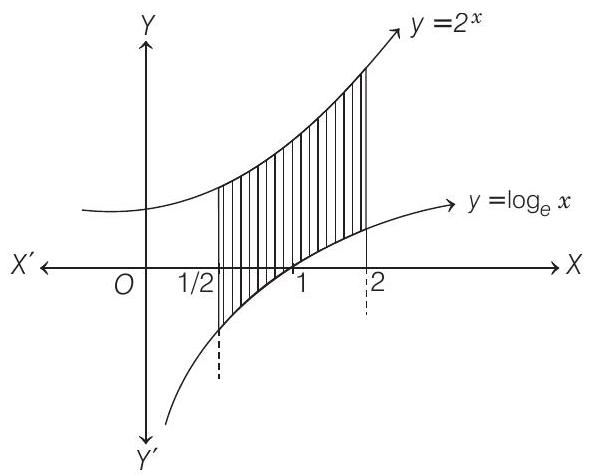 - Sketch the curves and identify the region bounded by $x=1 / 2, x=2, y=\log x$ and $y=2^{x}$. Find the area of this region.