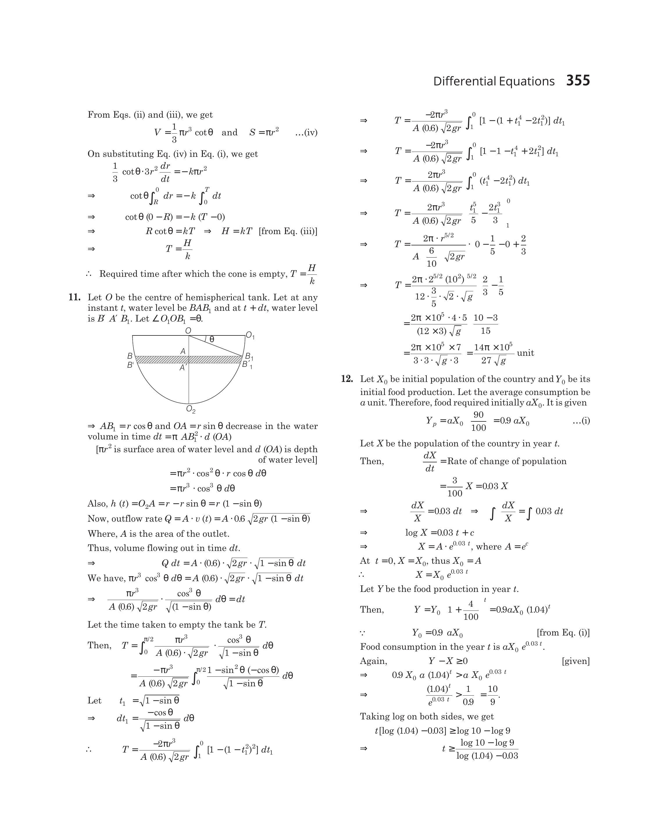 - A hemispherical tank of radius $2 m$ is initially full of water and has an outlet of $12 cm^{2}$ cross-sectional area at the bottom. The outlet is opened at some instant. The flow through the outlet is according to the law $v(t)=0.6 \sqrt{2 g h(t)}$, where $v(t)$ and $h(t)$ are respectively the velocity of the flow through the outlet and the height of water level above the outlet at time $t$ and $g$ is the acceleration due to gravity. Find the time it takes to empty the tank.