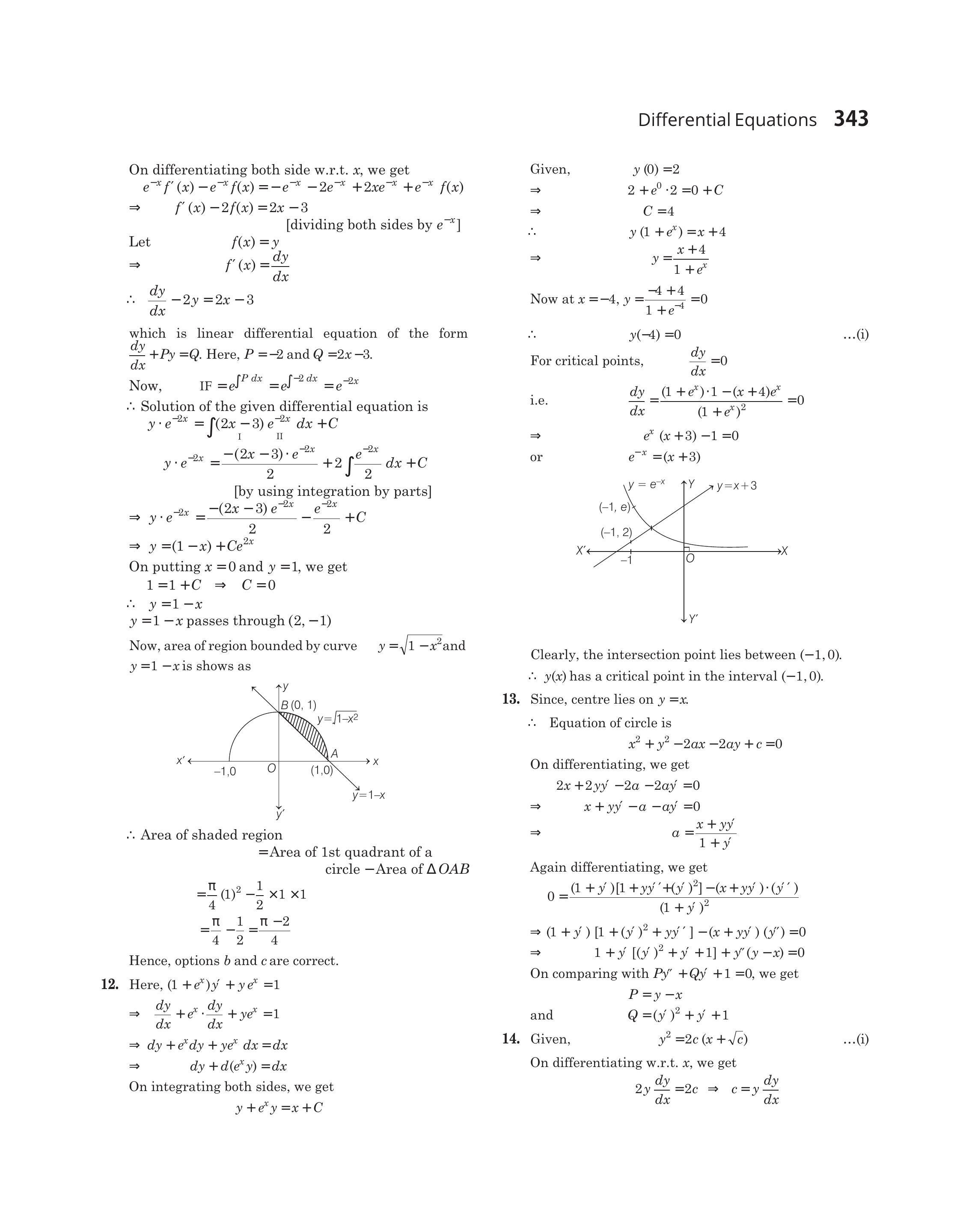 $$ \begin{aligned} & \text { Given, } \quad y(0)=2 \\ & \Rightarrow \quad 2+e^{0} \cdot 2=0+C \\ & \Rightarrow \quad C=4 \\ & \therefore \quad y\left(1+e^{x}\right)=x+4 \\ & \Rightarrow \quad y=\frac{x+4}{1+e^{x}} \\ & \text { Now at } x=-4, y=\frac{-4+4}{1+e^{-4}}=0 \\ & \therefore \quad y(-4)=0 \\ & \text { For critical points, } \quad \frac{d y}{d x}=0 \\ & \text { i.e. } \quad \frac{d y}{d x}=\frac{\left(1+e^{x}\right) \cdot 1-(x+4) e^{x}}{\left(1+e^{x}\right)^{2}}=0 \\ & \Rightarrow \quad e^{x}(x+3)-1=0 \\ & \text { or } \quad e^{-x}=(x+3) \end{aligned} $$