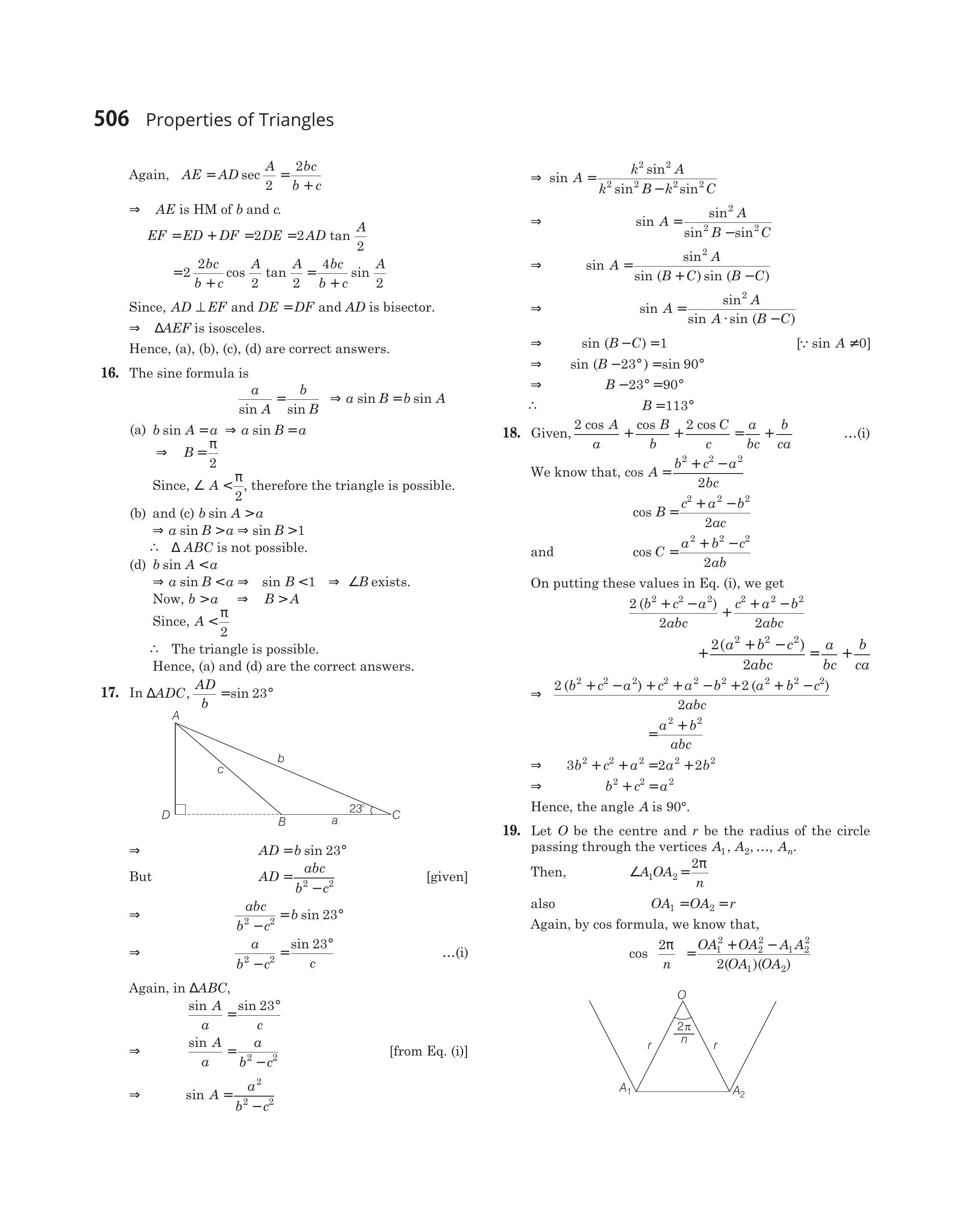 $$ \begin{array}{rlrl} \Rightarrow & A D & =b \sin 23^{\circ} \\ \text { But } & A D & =\frac{a b c}{b^{2}-c^{2}} \\ \Rightarrow & \frac{a b c}{b^{2}-c^{2}} & =b \sin 23^{\circ} \\ \Rightarrow & & \frac{a}{b^{2}-c^{2}} & =\frac{\sin 23^{\circ}}{c} \end{array} $$