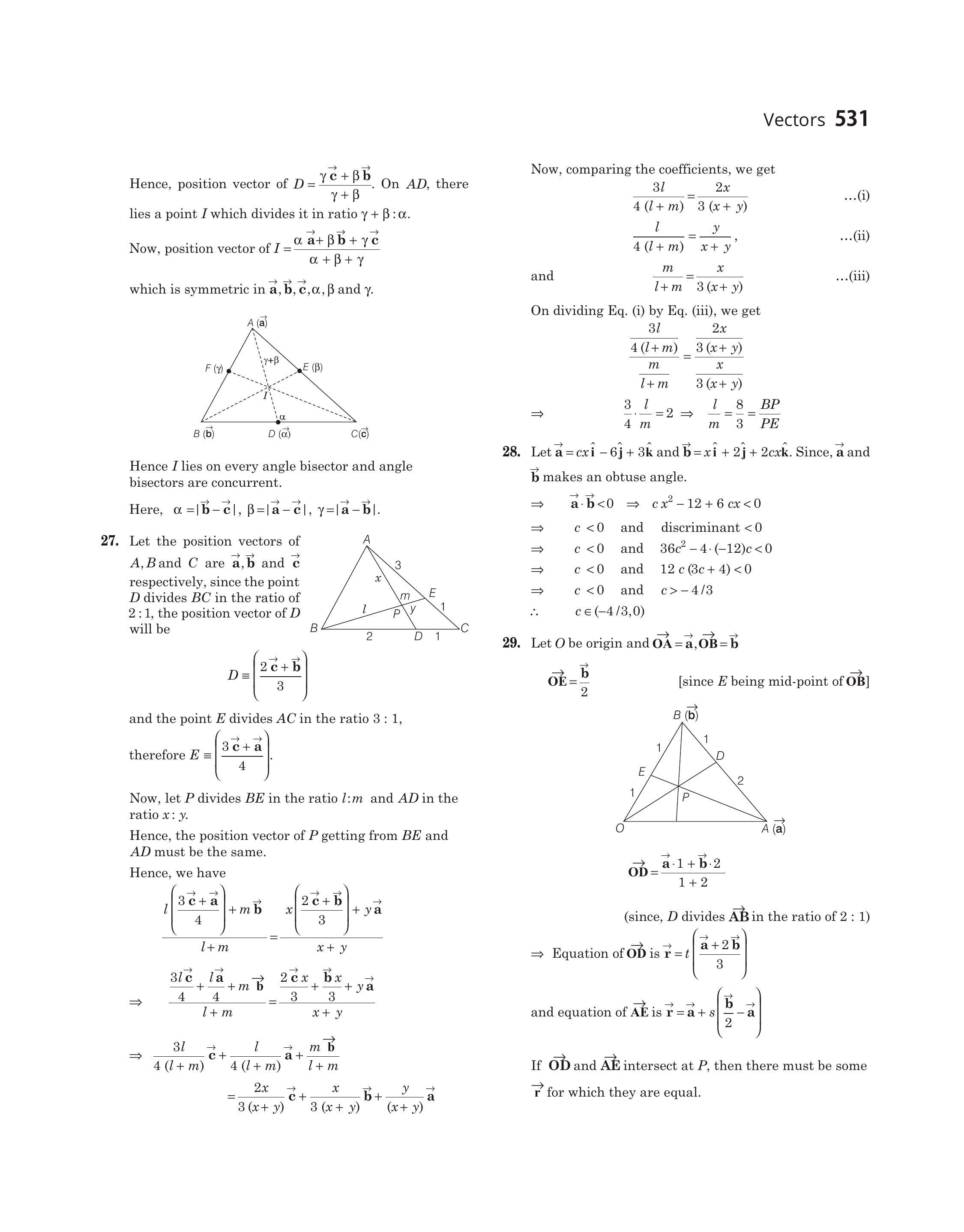 Hence, position vector of $D=\frac{\gamma \overrightarrow{\mathbf{c}}+\beta \overrightarrow{\mathbf{b}}}{\gamma+\beta}$. On $A D$, there lies a point $I$ which divides it in ratio $\gamma+\beta: \alpha$.