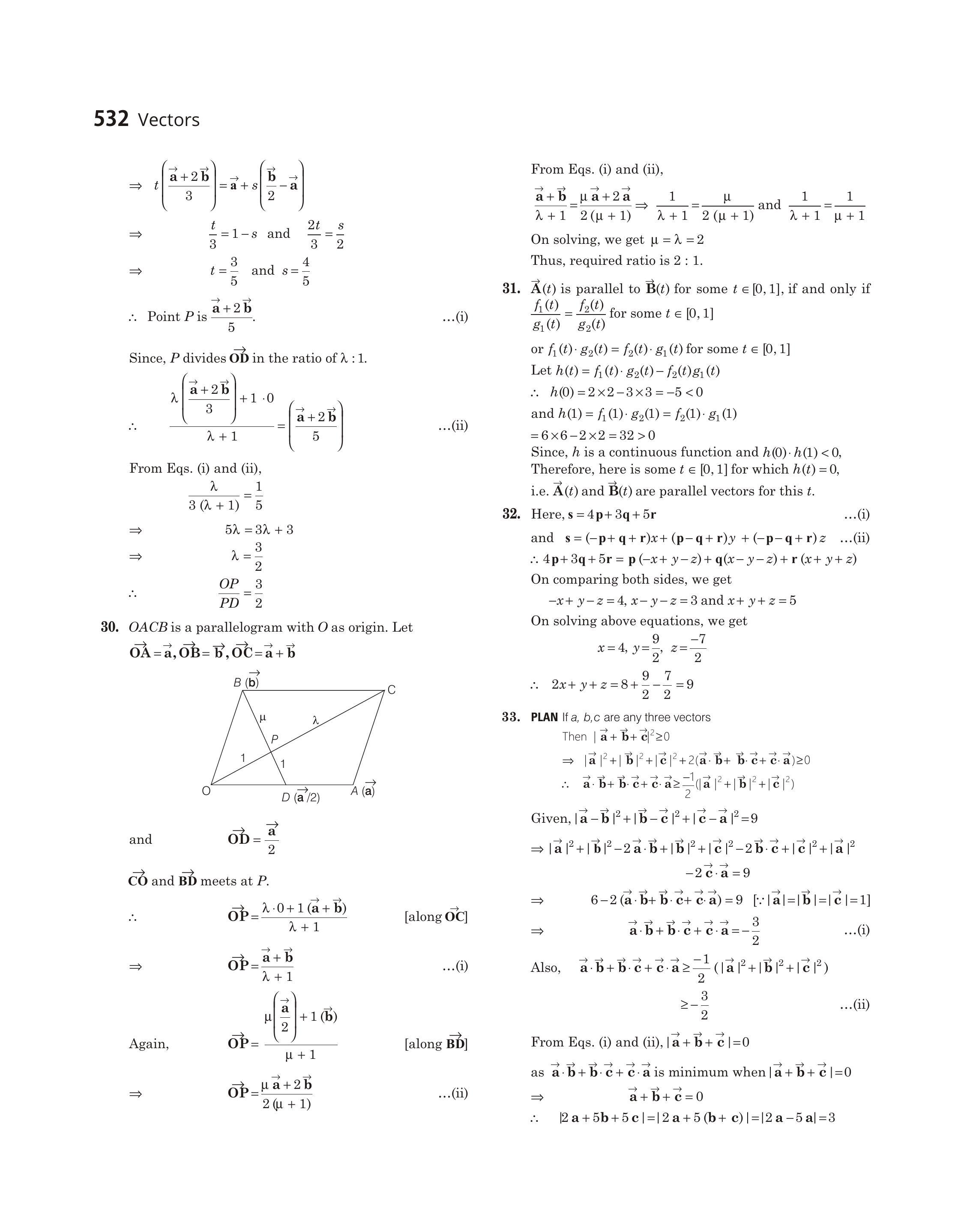 $ \begin{array}{ll} \therefore & \overrightarrow{\mathbf{O P}}=\frac{\lambda \cdot 0+1(\overrightarrow{\mathbf{a}}+\overrightarrow{\mathbf{b}})}{\lambda+1} \\ \Rightarrow & \overrightarrow{\mathbf{O P}}=\frac{\overrightarrow{\mathbf{a}}+\overrightarrow{\mathbf{b}}}{\lambda+1}……(i) \\ \text { Again, } & \overrightarrow{\mathbf{O P}}=\frac{\mu\left(\overrightarrow{\mathbf{a}} \frac{2}{2}\right)+1(\overrightarrow{\mathbf{b}})}{\mu+1} \\ \Rightarrow & \overrightarrow{\mathbf{O P}}=\frac{\mu \overrightarrow{\mathbf{a}}+2 \overrightarrow{\mathbf{b}}}{2(\mu+1)}……(ii) \end{array} $