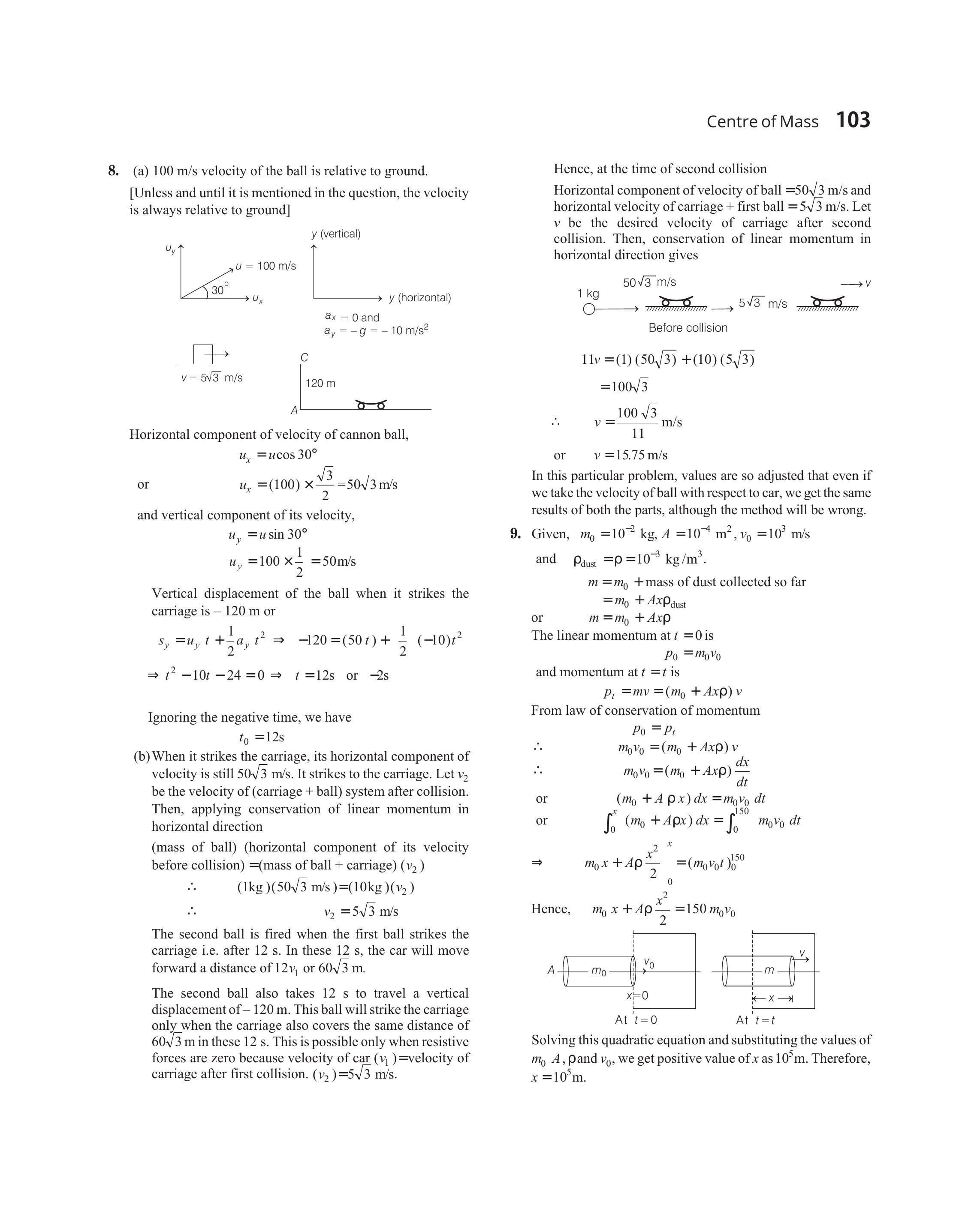 (b) When it strikes the carriage, its horizontal component of velocity is still $50 \sqrt{3} , \text{m/s}$. It strikes the carriage. Let $v_2$ be the velocity of (carriage + ball) system after collision. Then, applying conservation of linear momentum in horizontal direction