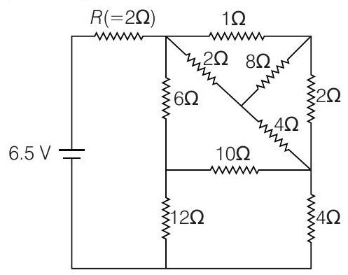 - In the following circuit, the current through the resistor $R(=2 \Omega)$ is $I$ amperes. The value of $I$ is