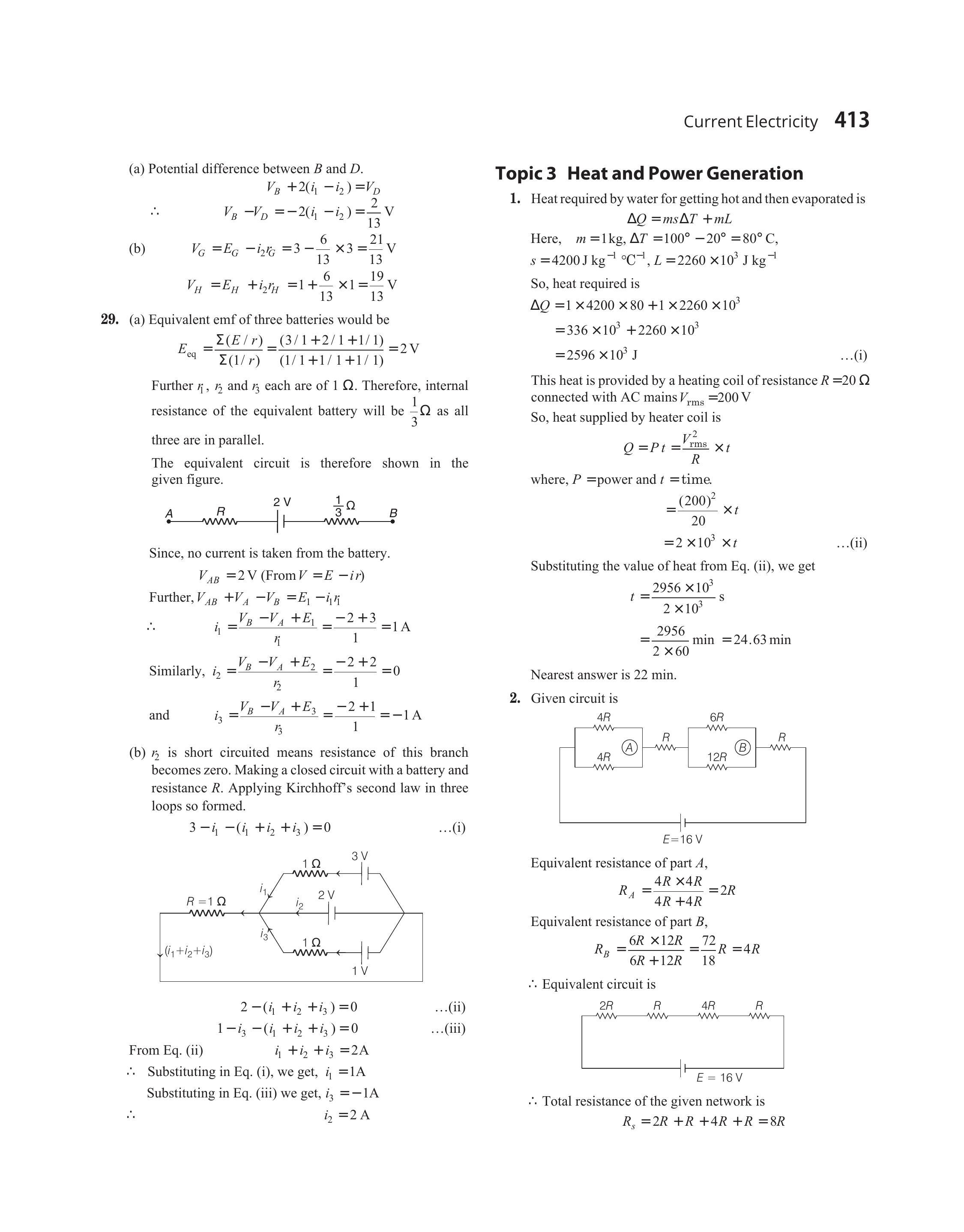 $ \begin{alignedat} & \qquad V _{A B}=2 V(\text { From } V=E - i r) \\ & \text { Further, } V _{A B}+V _A-V _B=E _1-i _1 r _1 \\ & \therefore \quad i _1=\frac{V _B-V _A+E _1}{r _1}=\frac{-2+3}{1}=1 A \\ & \text { Similarly, } i _2=\frac{V _B-V _A+E _2}{r _2}=\frac{-2+2}{1}=0 \\ & \text { and } \quad i _3=\frac{V _B-V _A+E _3}{r _3}=\frac{-2+1}{1}=-1 A \end{aligned} $