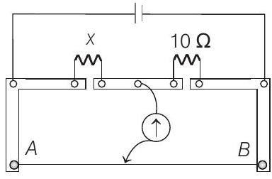 - A meter bridge is set-up as shown in figure, to determine an unknown resistance $X$ using a standard $10$ $ \Omega$ resistor. The galvanometer shows null point when tapping-key is at $52 $ $cm$ mark. The end-corrections are $1 $ $cm$ and $2 $ $cm$ respectively for the ends $A$ and $B$. The determined value of $X$ is