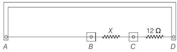 (c) After appropriate connections are made, it is found that no deflection takes place in the galvanometer when the sliding jockey touches the wire at a distance of $60 cm$ from $A$. Obtain the value of the resistance $X$.